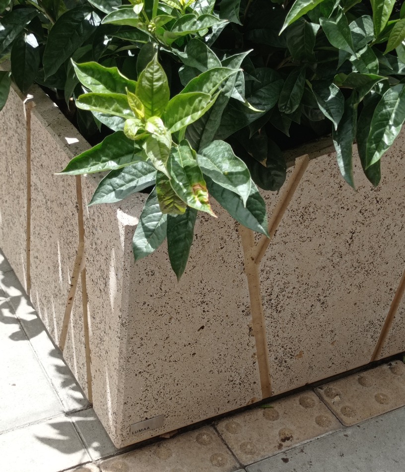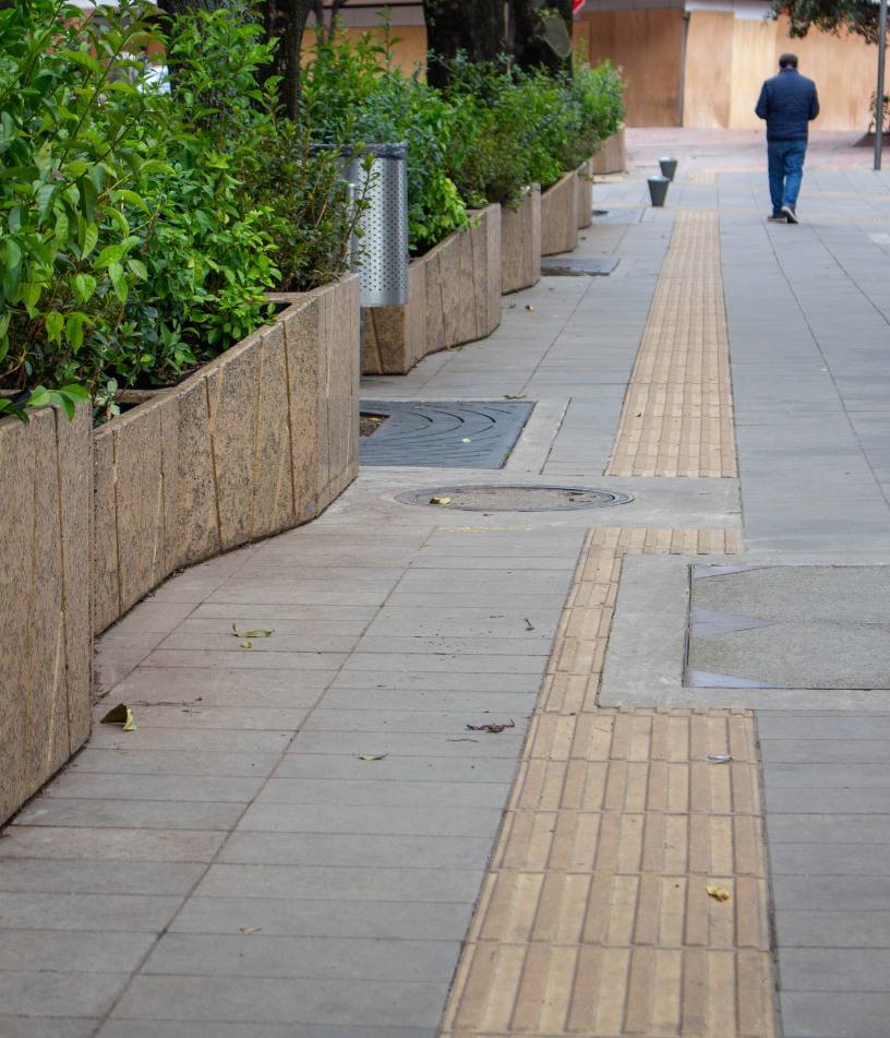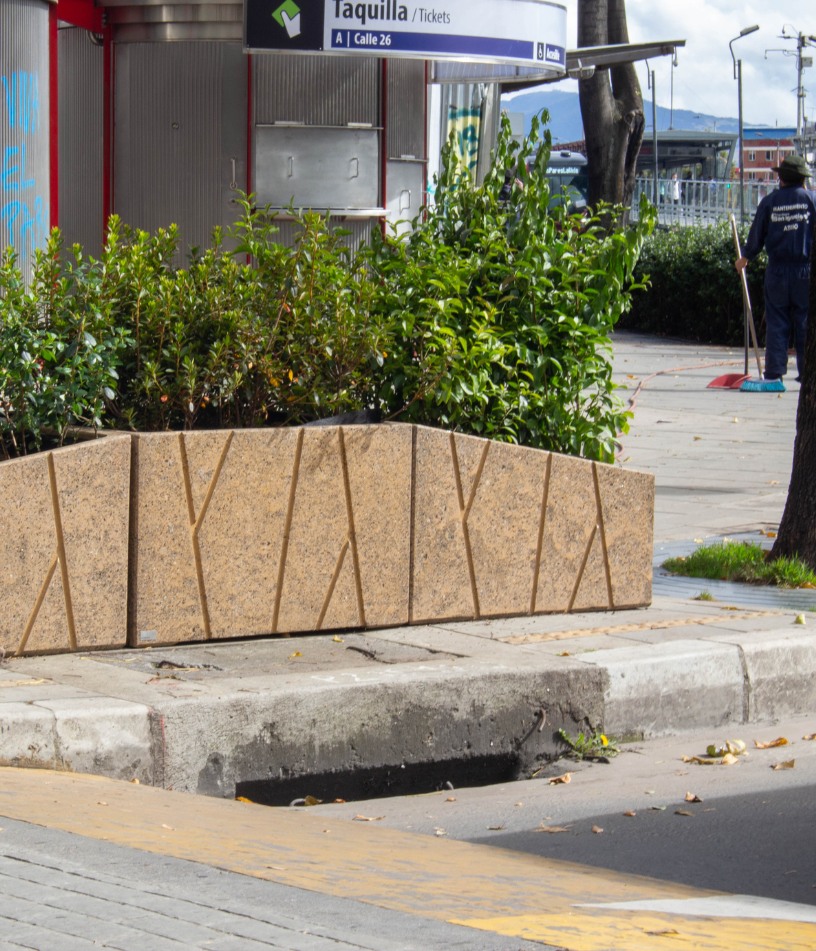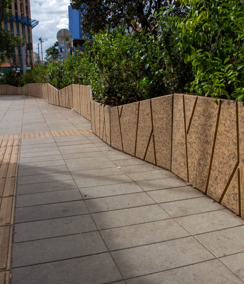 Dentro del urbanismo táctico realizado en la manzana donde se localizan las torres Atrio y el Centro de Comercio Internacional (CCI) se decidió la implementación de materas en concreto arquitectónico con caucho reciclado.